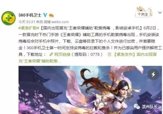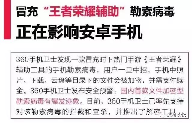 360手机卫士发现一款冒充《王者荣耀》辅助工具的手机勒索病毒 。不要让孩子沉迷游戏。醒王心荣